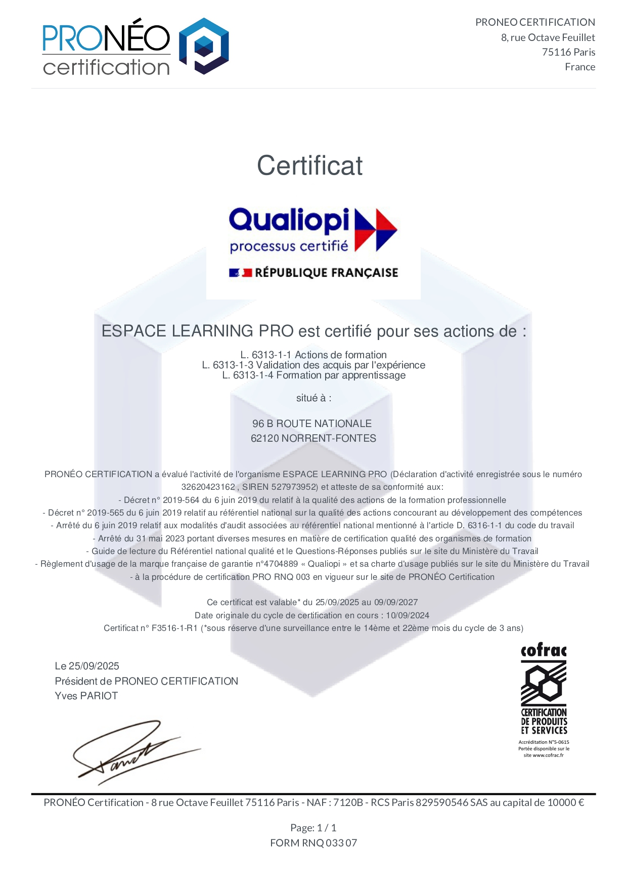 Crée depuis Juin 2017, Espace Learning Pro est approuvé Datadock et depuis Septembre 2021 nous sommes également certifiés Qualiopi ce qui assure une qualité de prestations aux personnes qui souhaitent intégrer nos différentes sessions de formations.